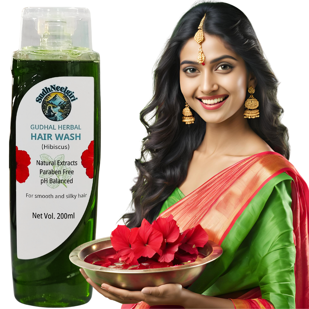 Rediscover the power of Ayurveda with SudhNeelgiri Hibiscus Hair Growth Herbal Shampoo – a premium, chemical-free formula curated from the traditions of Kerala. Made from hibiscus flowers and herbs sourced from the Nilgiri Hills, this shampoo comes in a rich greenish hue and is crafted to nourish your scalp, reduce hair fall, and promote thick, healthy hair.